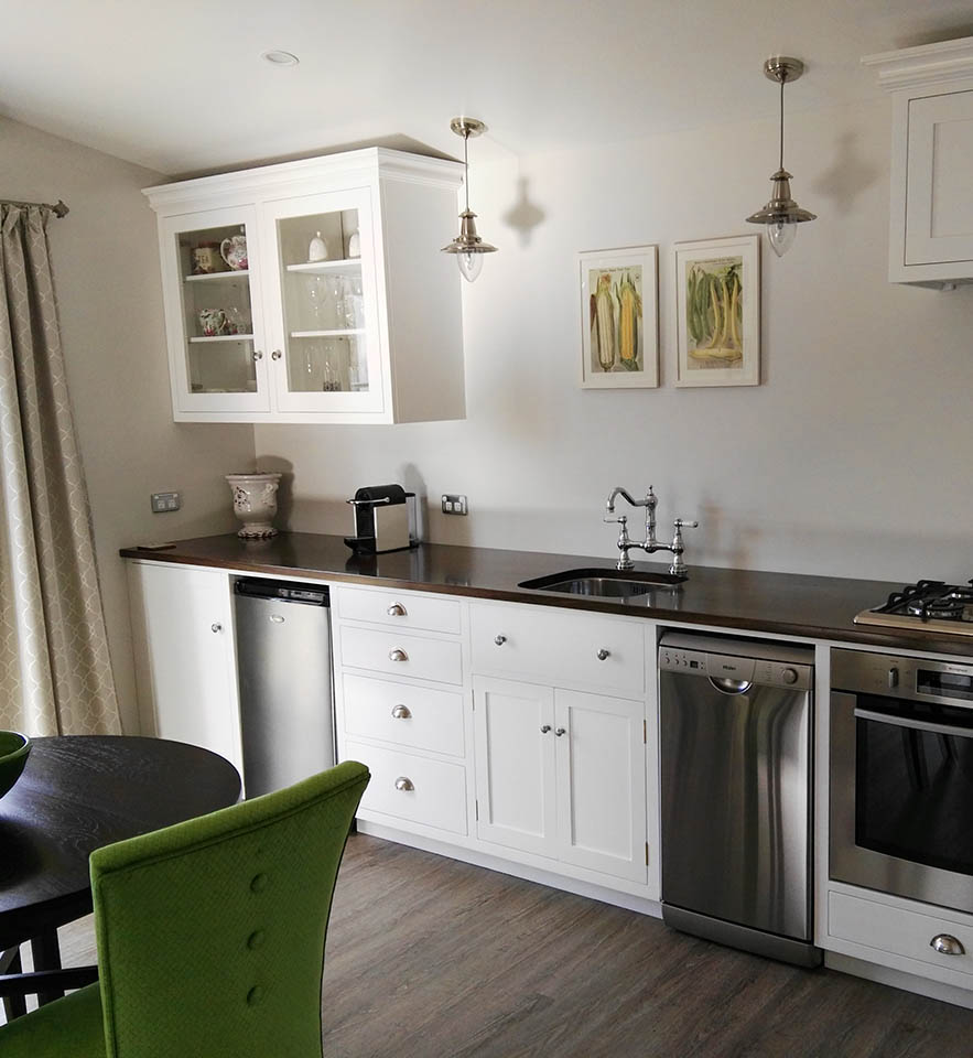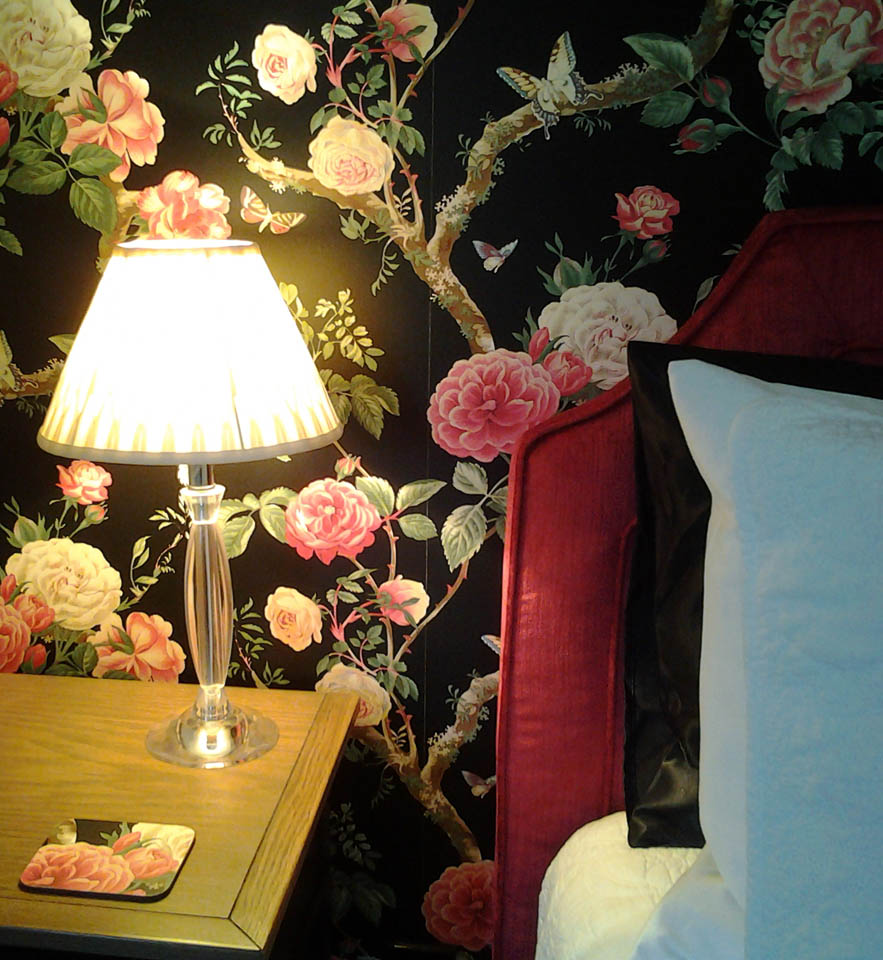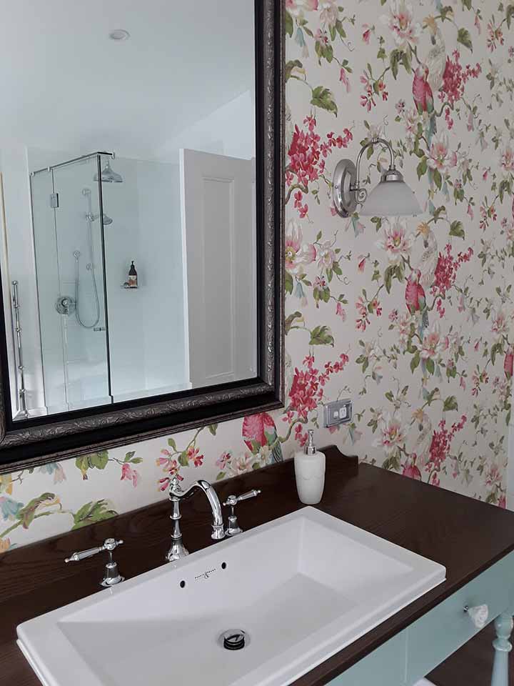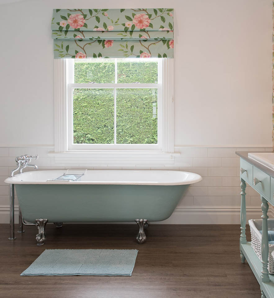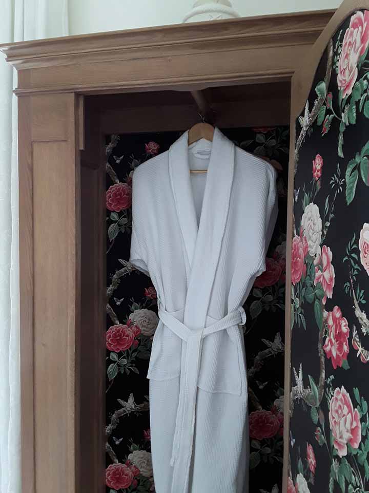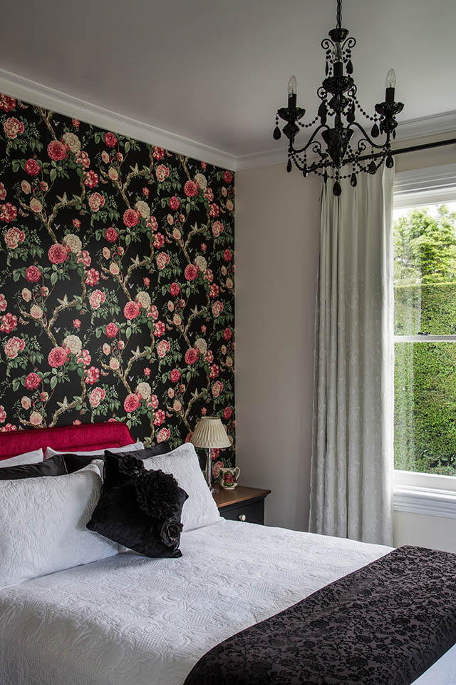 The large bathroom, luxuriously appointed with a claw foot bath to relax in, a large shower with extra “rain falling” ceiling rose, and hand crafted cabinetry set against the backdrop of beautiful botanical wallpaper. Heated towel rails, hairdryer and locally made soaps and toiletry requirements are all supplied.