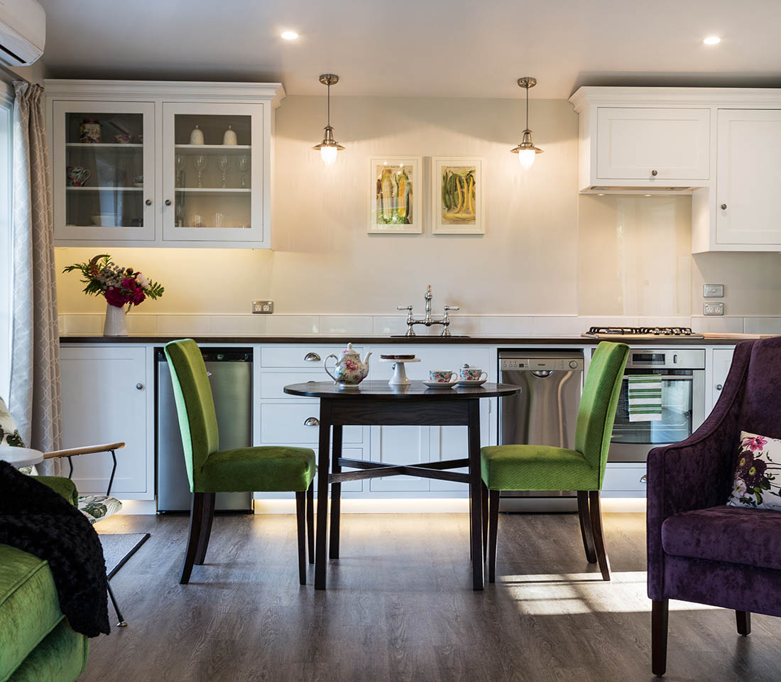 Laurella has been designed as a luxury one bedroom cottage and the sumptuous Queen bed will assure you of a peaceful night’s sleep. Delightful views from the bedroom into the Gazebo Garden give a feeling of tranquillity and seclusion. Robes are also provided for your use and relaxation.